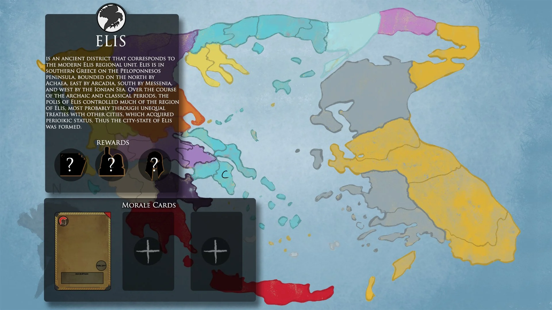 Depending on the order that the game is played the user may have an easier experience picking up the -12% Morale card at Argos City, rather than the 7% Morale card at Elis City, placing these cards in the trial version allow us to show how diverse the game can be, and the possibility of pathing their difficulty curve. The user can choose to use these cards to make the game easier, or play a dry run without Morale cards.